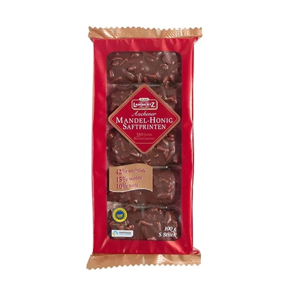 – Ingredients: Wheat flour, sugar, almonds (15%), honey (10%), cocoa mass, cocoa butter, full-fat milk powder, brown sugar, sweet whey powder, powdered sugar, raising agents (sodium carbonates, potassium carbonates), spice mix, star anise, emulsifier (soy lecithin), glucose-fructose syrup, butter.