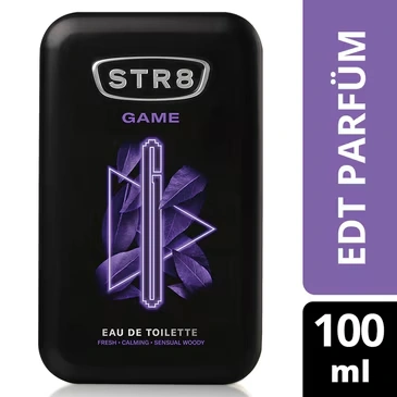 The packaging of Str8 Game Parfum features a youthful and daring design, characterized by modern graphics and bright colors. This contemporary presentation makes it a stylish addition to any countertop or grooming kit.
