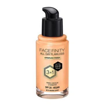 Max Factor Facefinity 3-in-1 Foundation SPF20, Warm Sand 70 is a multi-functional makeup product designed to simplify the beauty routine by combining the benefits of a primer, foundation, and concealer into one formulation. This foundation provides a professional look with ease of application, making it an essential addition to any makeup collection. With built-in sun protection and a lightweight formula, it enhances the skin while preventing shine.