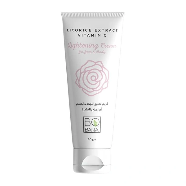 Bobana Skin Lightening Cream for Face and Body, 60 grams is a natural and safe skin lightening cream designed specifically for both the face and body. This product contains potent natural ingredients, particularly licorice extract, which effectively lightens skin tone by up to five shades. It addresses skin pigmentation issues, dark spots, and uneven skin tone while ensuring a smooth and radiant appearance.