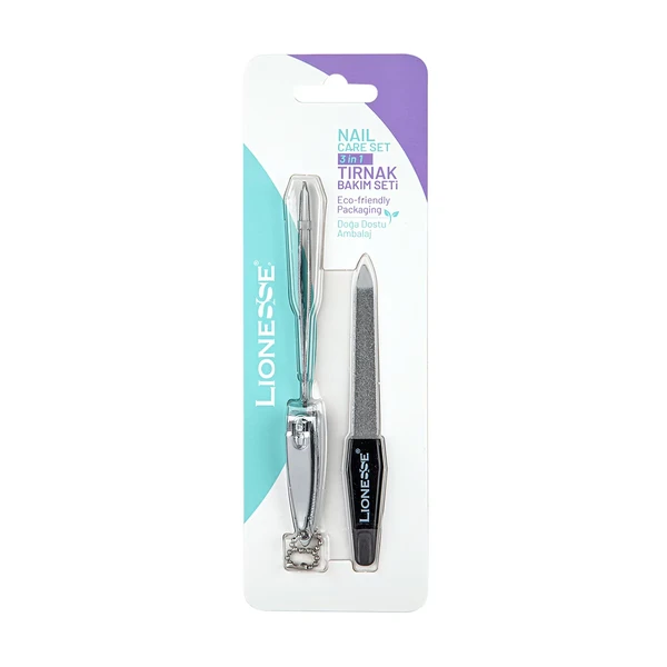 The Lionesse Nail Care Set includes a nail clipper, tweezers, and a nail file, providing essential tools for nail grooming and maintenance. This set is designed for individuals who prioritize personal care and seek effective, high-quality tools to address their nail care needs. Each tool serves a specific function, ensuring a comprehensive approach to nail hygiene and appearance.