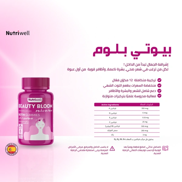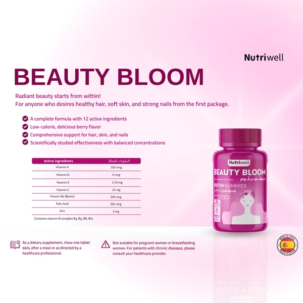 Nutri-Well Biotin Beauty Bloom is formulated with a comprehensive range of essential vitamins including Vitamin D, B5, B6, B3, B12, and Folate. This ensures that your body receives a well-rounded set of nutrients that are crucial for beauty and overall health.