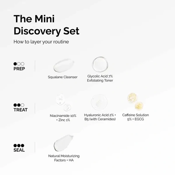 The set includes six travel-sized products: Squalane Cleanser, Glycolic Acid 7% Toning Solution, Niacinamide 10% + Zinc 1%, Hyaluronic Acid 2% + B5, Caffeine 5% + EGCG, and Natural Moisturizing Factors + HA, all presented in a biodegradable bag.