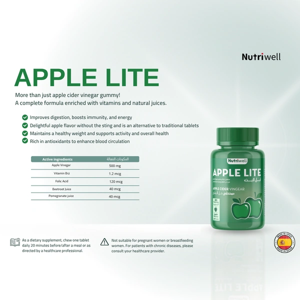 Nutri-Well Apple Cider Vinegar Light Supplement is a dietary supplement presented in the form of delightful gummies. Each gummy combines the benefits of natural apple cider vinegar, dried pomegranate juice, and dried beet juice, designed to support digestion, enhance energy levels, and assist in weight management. This supplement is suitable for those looking to incorporate the health benefits of apple cider vinegar into their daily routine in a convenient and enjoyable manner.