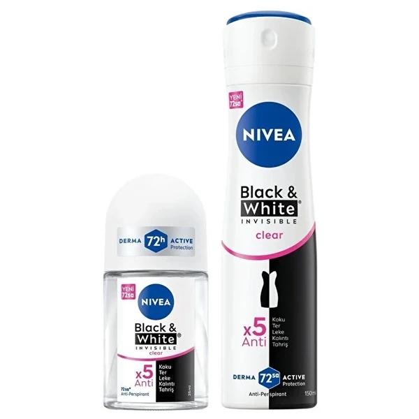 – Set Includes: 1 x NIVEA Black&White Clear Spray Deodorant (150ml) and 1 x NIVEA Black&White Clear Roll-On (25ml)