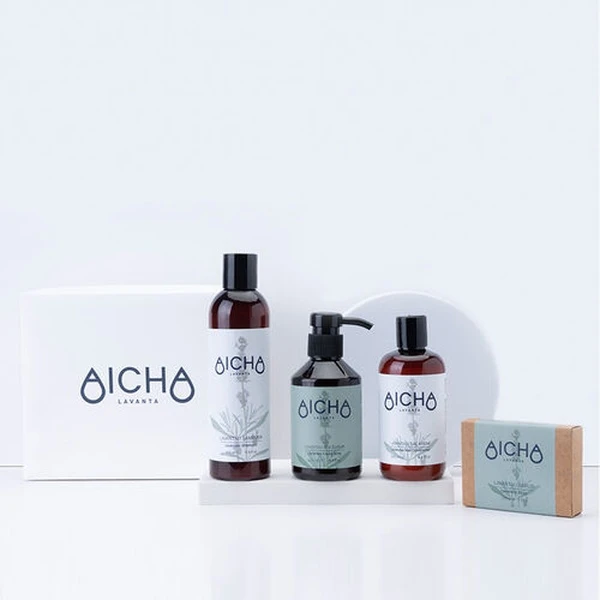 – Lavender Shampoo: Apply a small amount to your palms and massage into your scalp and hair. Rinse thoroughly with water. For best results, follow with Aicha Lavender Conditioner.