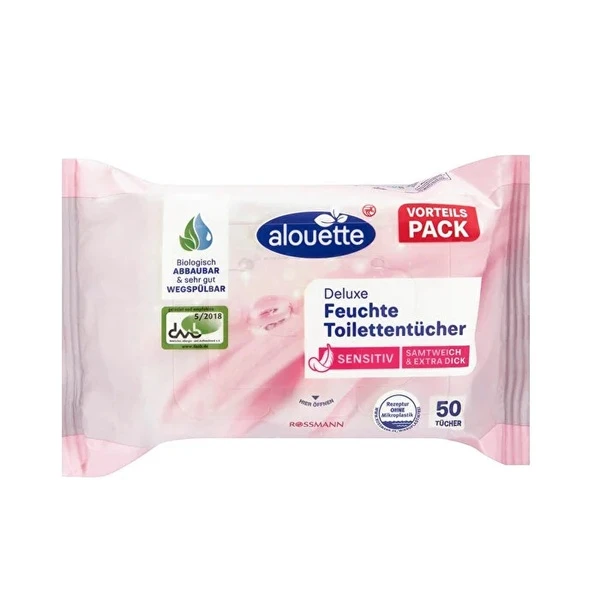 Alouette Aloe Vera Unscented Wet Toilet Paper 3-Pack is designed to provide a gentle and effective cleansing experience. Formulated with aloe vera, this product ensures comfort and cleanliness while being free from fragrances, making it suitable for sensitive skin. Additionally, it has been tested and recommended by the German Allergy and Asthma Association (DAAB), ensuring a high standard of quality and safety.