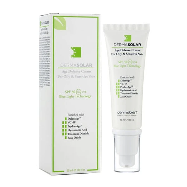 Dermasolar SPF30 Age Defence Cream for Oily Sensitive Skin 50ml is a specialized skincare product designed to protect and nourish oily and sensitive skin types. This cream combines advanced Blue Light technology with a unique blend of antioxidants to safeguard the skin from both UV and visible light exposure. It also offers age-defence benefits, making it an essential addition to daily skincare routines.