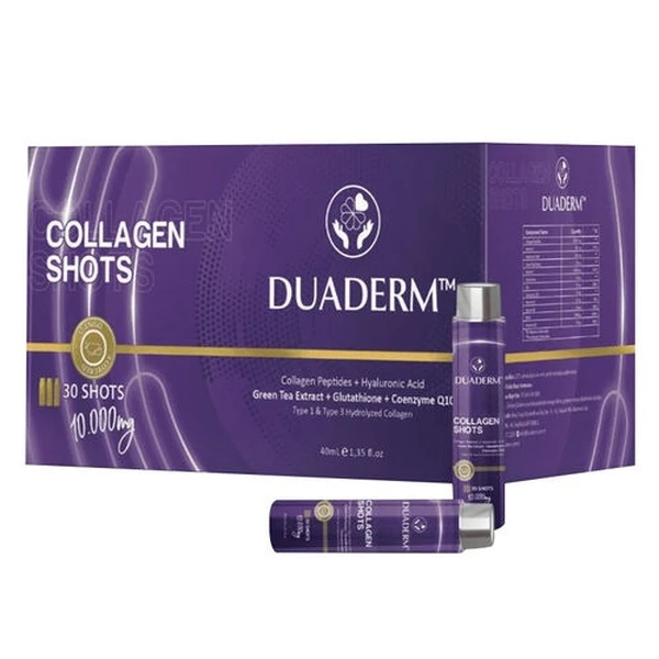 Duaderm Collagen Shots are designed to support youthful skin through the power of collagen. Each pack contains 30 tubes of 40ml collagen shots featuring Types 1 and 3 collagen, known for their effectiveness in promoting skin elasticity and hydration. This product is intended for adults seeking to enhance their skin’s appearance and maintain its youthful quality.
