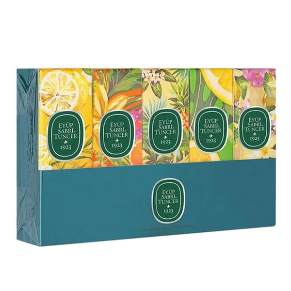 The Eyüp Sabri Tuncer Citrus Cologne Set features five unique fragrances: Classic Lemon, Bodrum Mandarin, Çeşme Lemon, Verbena Citrus, and Hawaii Pineapple. Each scent offers a fresh and lively profile that revitalizes the senses and promotes a sense of well-being.