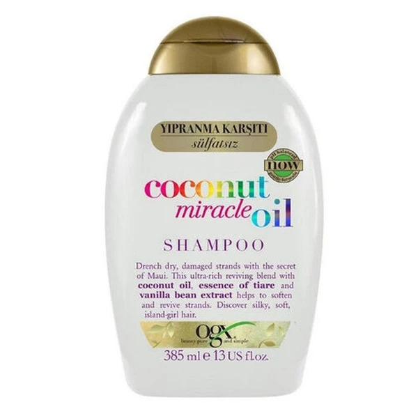 OGX Coconut Miracle Oil Shampoo 385ml – Nourishing & Hydrating is a specialized hair care product designed to provide restorative benefits for dry and damaged hair. This shampoo combines the nourishing properties of coconut oil, the essence of Tiare flower, and vanilla bean extract to strengthen hair strands and enhance softness. The sulfate-free formula ensures that hair retains its natural moisture while being cleansed effectively.