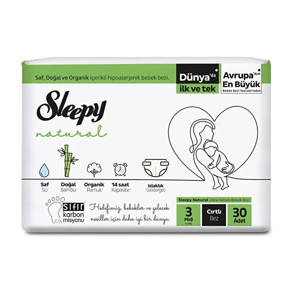 Sleepy Baby Bamboo Cotton Diaper – Pure Water Comfort is Türkiye’nin saf su, bambu ve pamuk özelliklerini buluÅŸturan ilk ve tek bebek bezi. This innovative diaper combines the natural softness of bamboo and cotton with the purity of Turkey’s water, creating a product designed to provide comfort and safety for infants. It is essential for parents seeking high-quality and gentle diapering solutions.