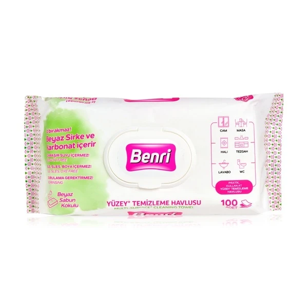 Салфетки для уборки Benri – 100 безупречных салфеток предназначены для эффективной очистки различных поверхностей в вашем доме. С уникальным сочетанием белого уксуса и пищевой соды, эти салфетки справляются с трудными пятнами, оставляя освежающий аромат белого мыла. Они не требуют ополаскивания и не содержат отбеливателей, SLS, SLES и красителей, что делает их надежным выбором для поддержания чистоты в вашем окружении.