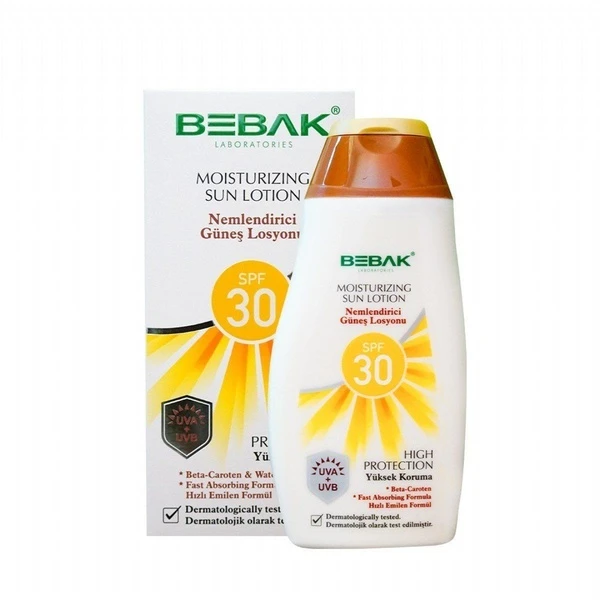 Увлажняющее солнцезащитное молочко 30 SPF от Bebak эффективно защищает кожу от UVA и UVB лучей. UVA лучи могут вызывать длительное повреждение кожи, приводя к преждевременному старению, в то время как UVB лучи в основном ответственны за солнечные ожоги. Используя это солнцезащитное молочко, кожа защищена от вредного воздействия солнечного света, что крайне важно для поддержания здоровья и внешнего вида кожи.