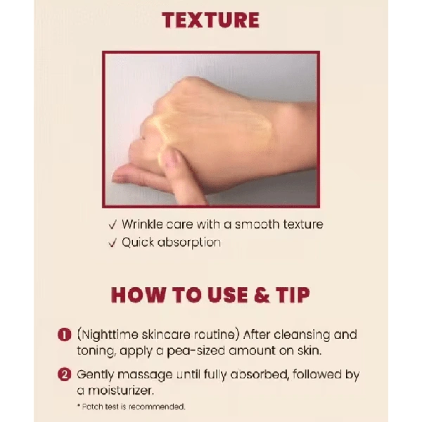 После очищения и тщательной сушки кожи нанесите подходящее количество сыворотки на лицо и шею. Массируйте мягкими круговыми движениями до полного впитывания. Рекомендуется использовать сыворотку вечером перед сном, хотя утреннее применение с подходящей защитой от солнца также эффективно. Начните с 2-3 применений в неделю, чтобы позволить коже адаптироваться, постепенно увеличивая использование в зависимости от переносимости кожи. Избегайте сочетания с продуктами, содержащими витамин C или сильные кислоты, чтобы предотвратить раздражение.