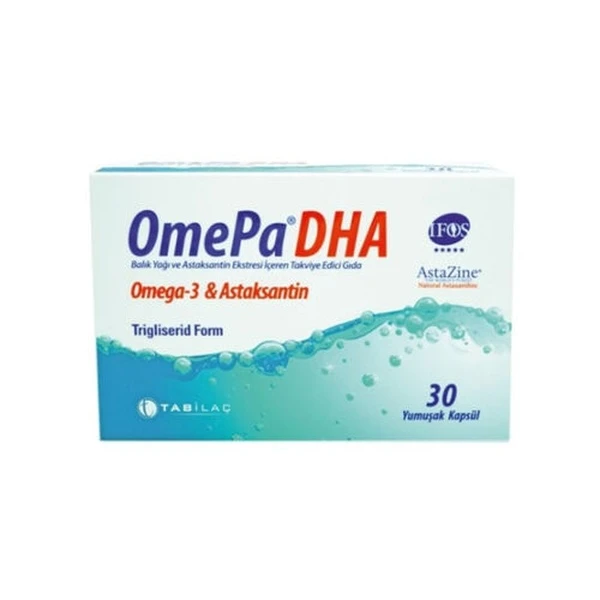 Таб Илач Омепа DHA Пищевая добавка – 30 капсул является пищевой добавкой, разработанной для поддержки общего здоровья благодаря богатому составу рыбьего жира и экстракта астаксантина. Этот продукт предназначен для взрослых в возрасте от 11 лет и старше, обеспечивая необходимые питательные вещества, которые способствуют различным функциям организма. Включение омега-3 жирных кислот, особенно DHA и EPA, критически важно для поддержания здоровья сердца и поддержки когнитивной функции.
