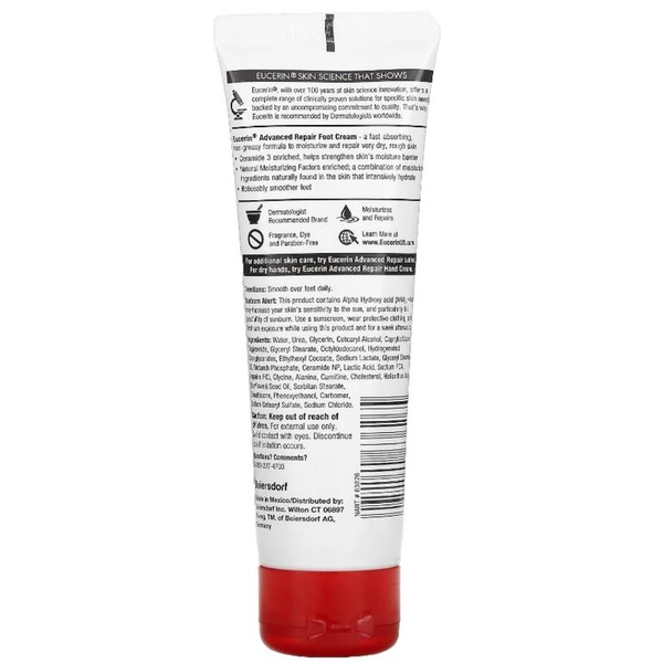 Крем для ног Eucerin Advanced Foot Repair без запаха 85г — это специализированный увлажняющий крем, разработанный для эффективного ухода за чрезвычайно сухой и грубой кожей на ногах. Этот продукт особенно полезен для людей, испытывающих сильную сухость или шероховатость кожи, предлагая целенаправленное решение для ухода за ногами. Он не содержит ароматизаторов, красителей или парабенов, что делает его подходящим для чувствительной кожи и рекомендованным дерматологами по всему миру.